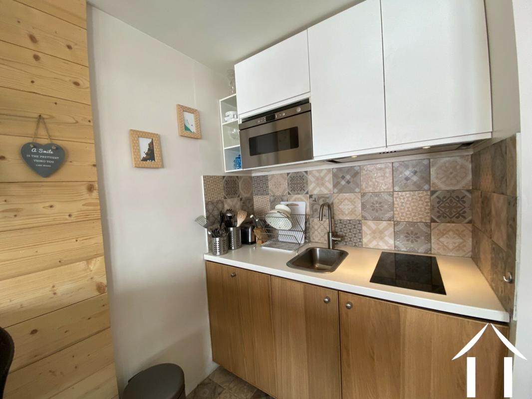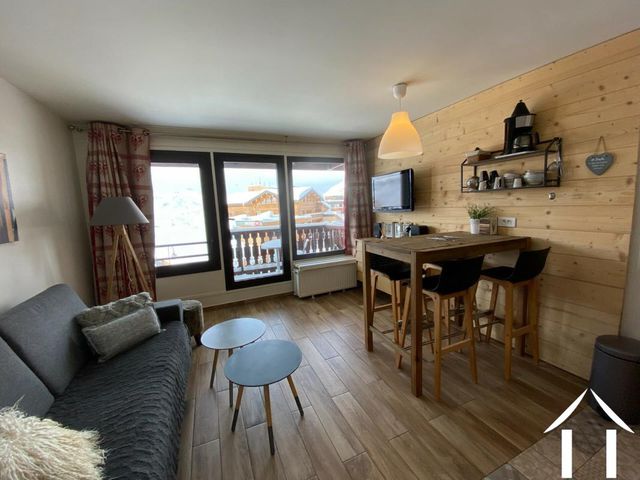 L'appartement orienté sud-ouest comprend un coin montagne indépendant, une salle de bain, WC, et une kitchenette ouverte sur un séjour ensoleillé grâce à son balcon avec une belle vue dégagée. L'intérieur est complètement remis à neuf et dégage une atmosphère très cocooning-lumineux. Les pistes et les commodités de la station sont à quelques pas de cette résidence. Vendu avec cave et casier à skis.