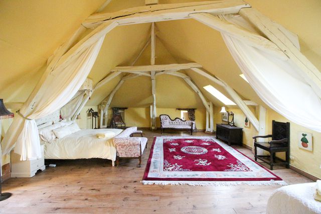 une autre chambre (33m2) et salle de bain (7m2) et grand placard (5m2). Cette pièce dispose d'un escalier en bois menant à une pièce (23m2) au rez-de-chaussée avec poêle à granulés et deux portes vers la cour.