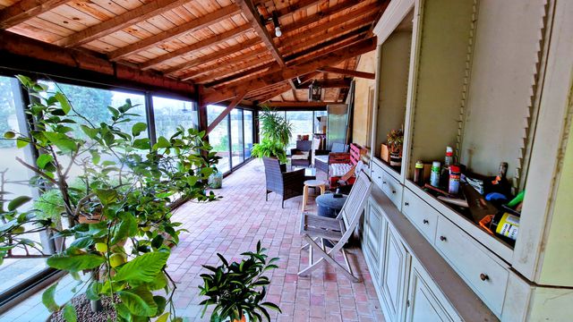 Salon élégant avec coin cheminée cosy, grande véranda avec vue sur le jardin exposé sud