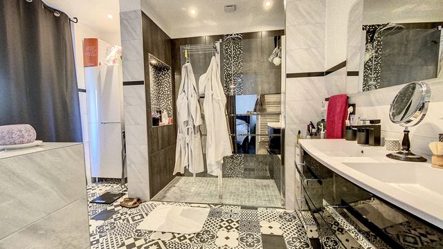 Elle se compose d'une vaste réception de 46 m² prolongée par une cuisine équipée de 16 m², d'une suite parentale de plain-pied avec chambre, dressing, salle de bains/douche et WC.