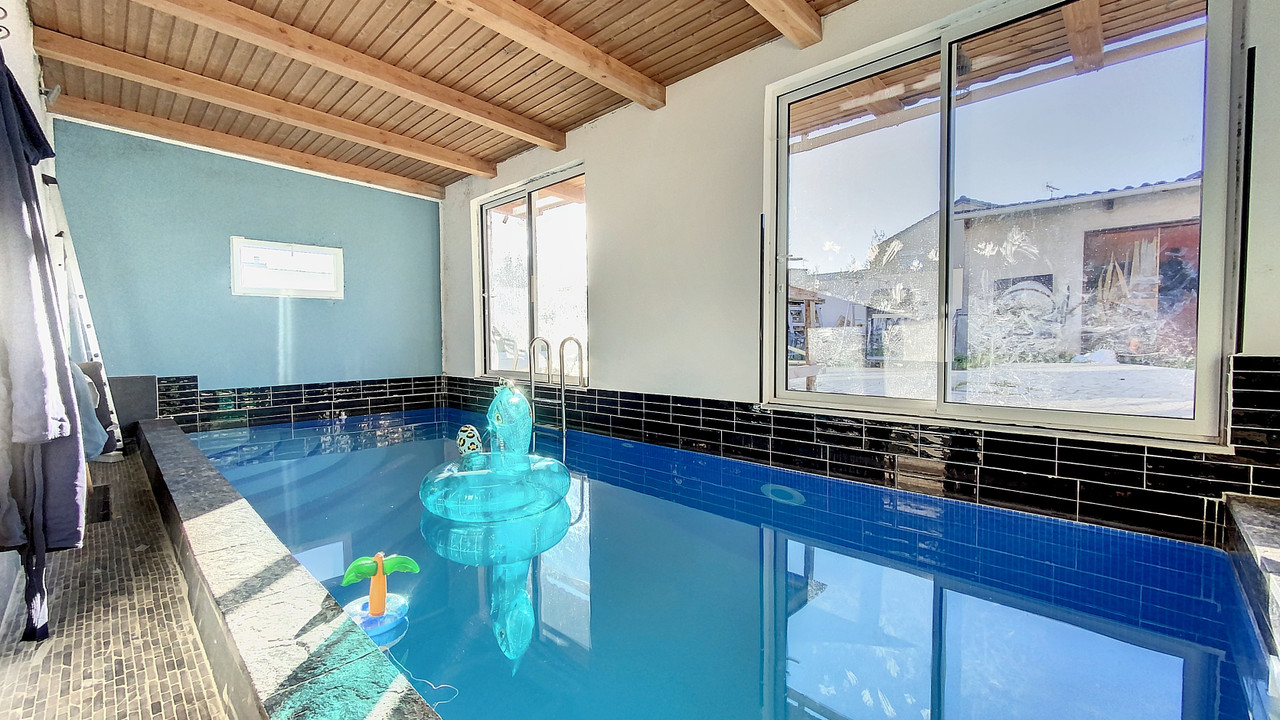 En rez-de-jardin, un niveau complet accueille une salle détente, une buanderie, une chaufferie, une salle d'eau et l'accès direct à la piscine intérieure chauffée (7 m x 3,5 m).