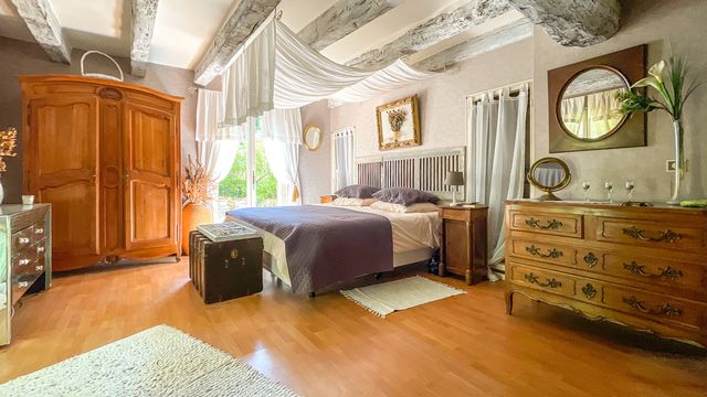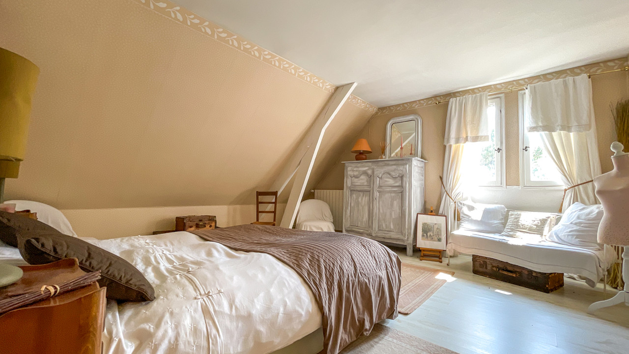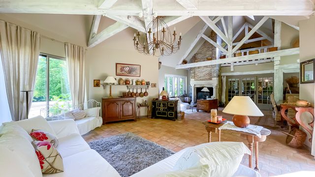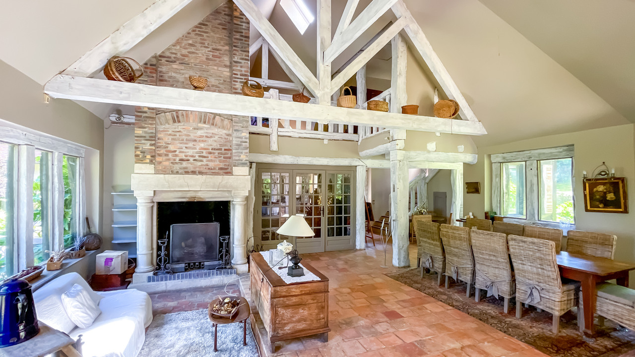 La maison offre un double séjour avec cheminées, 4 chambres, 3 salles de bains et terrasses donnant sur le jardin.