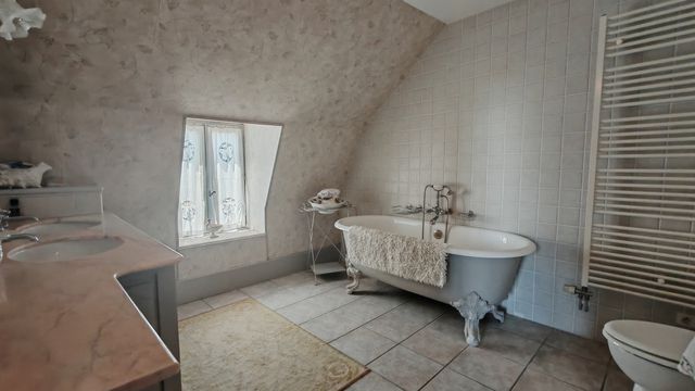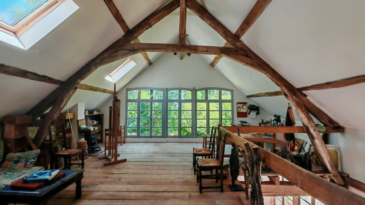 Organisé autour d'une charmante cour centrale, le domaine inclut un jardin paysager, une piscine avec vue imprenable et un atelier/studio indépendant. Le terrain de 3,9 hectares (10 acres) comprend prairies, étangs et vergers — idéal pour une maison familiale ou une activité d'accueil.