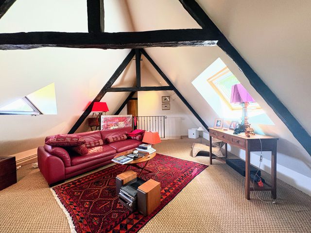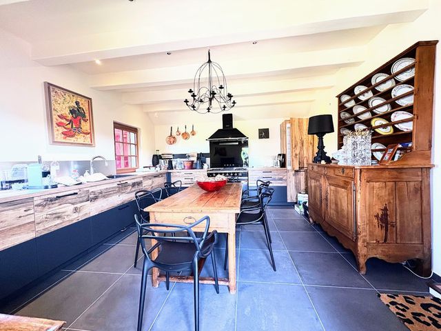 Entrez dans une cuisine contemporaine aménagée (22,2 m²) avec réfrigérateur intégré et finitions élégantes. La cuisine s'ouvre sur un espace bureau carrelé, idéal pour le télétravail ou les études, qui mène à un élégant salon (36,6 m²). Ici, vous découvrirez des poutres apparentes, un joli sol en pavés et un foyer d'époque, créant une atmosphère chaleureuse et accueillante.