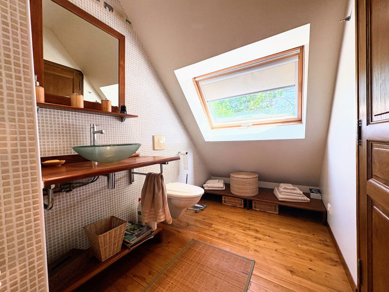 Attenante au salon, une élégante salle de bain avec toilette (6 m²) vous attend. Au fond de la maison se trouve une charmante chambre au rez-de-chaussée (24 m²) offrant une jolie vue sur le jardin.