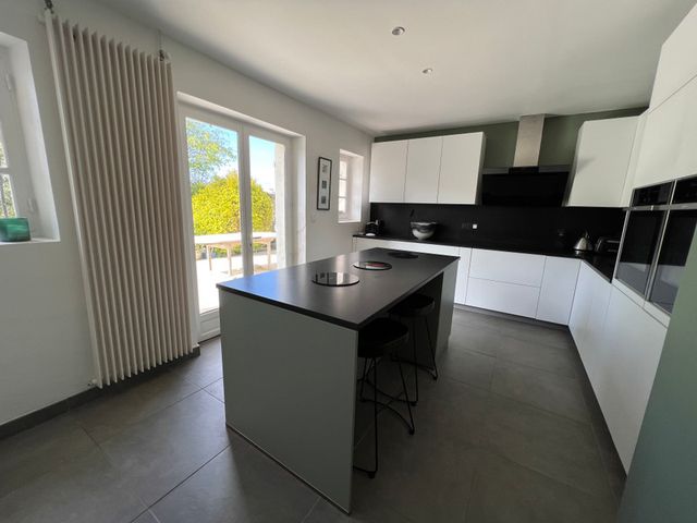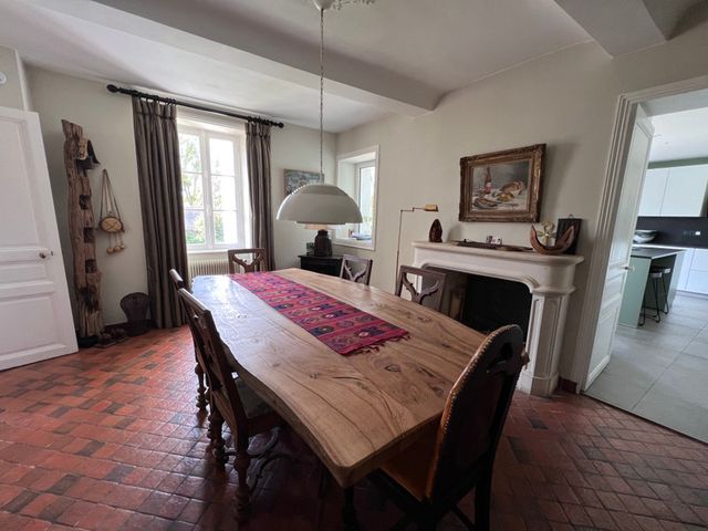 Au rez-de-chaussée de la maison principale se trouvent un salon, un bureau, une salle à manger, des toilettes et une cuisine. Les pièces de réception présentent des poutres et des cheminées apparentes. La cuisine, moderne et élégante, s'ouvre sur une terrasse par des portes coulissantes vitrées, offrant une vue sur le jardin clos de murs.