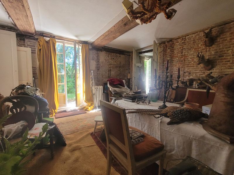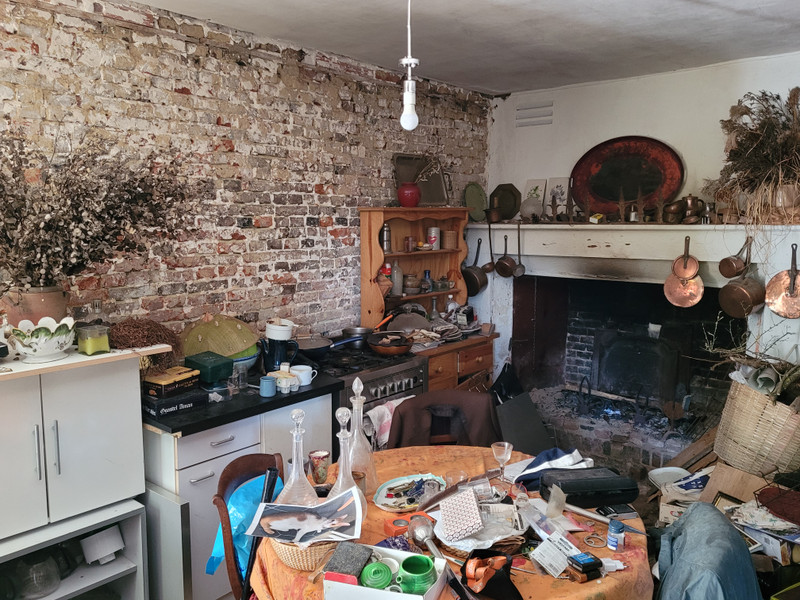 L'entrée de la maison donne sur un espace pouvant servir de bureau (12 m²), qui mène à la salle à manger (18 m²) dotée d'une cheminée et de carreaux d'époque. On accède au jardin par des portes-fenêtres, à la cuisine et au salon, ainsi qu'à une salle d'eau avec douche, WC et lavabo. Le salon (48 m²) nécessite encore des travaux de finition. La cuisine (34 m²), ornée de cheminées d'époque, présente une magnifique cheminée normande d'origine et des portes-fenêtres donnant sur le jardin.