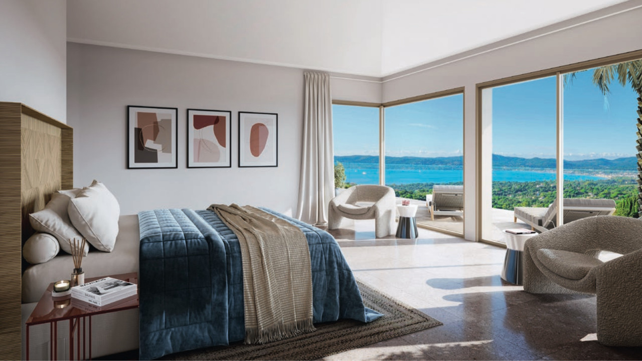 Au sein d'un domaine privé et sécurisé parmi les plus prisés de Beauvallon, superbe villa neuve offrant des vues panoramiques sur le Golfe de Saint-Tropez et les collines environnantes.