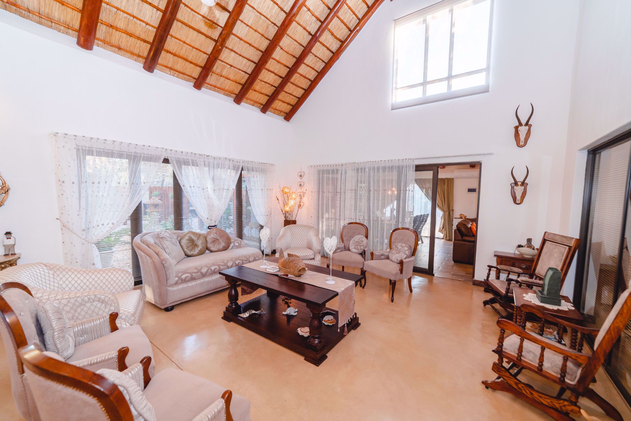 259 573 € (5 090 000 ZAR) ID: 160719Proudly presenting this beautiful Exclusive to Pam Golding property. Situated in a quiet area of Hoedspruit Wildlife Estate a stones throw from the wilderness area, lies this expansive 4 bedroom home. This enclosed property boasts a manicured water wise garden lovingly curated by the owner. The home is large and airy with 2 bedrooms en-suite downstairs and two bedrooms sharing a bathroom upstairs. The bottom floor boasts a double volume formal lounge and dining room that leads through sliding doors onto a covered patio as well as into an entertainment area with media room, kitchenette and guest loo. This leads to a solarium through sliding doors onto the braai area.