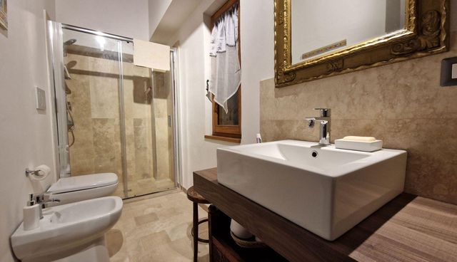 The main building has total surface of about 440 square meters on two levels. The first unit provides three bedrooms and two bathrooms, the second has four bedrooms and four bathrooms, of which one on the ground floor.