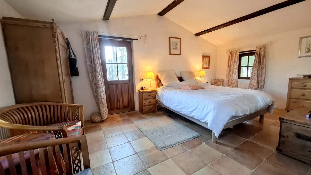 A42248GWI83 - Charmante maison de ferme en pierre aux volets bleus, située près du village authentique de Fox-Amphoux, qui dispose d'une école primaire, d'un bar, d'un restaurant et d'une boulangerie. À environ 15 minutes de Cotignac et d'Aups, cette belle demeure regorge de charme et de caractère d'antan. Elle bénéficie d'une magnifique véranda donnant sur la piscine, d'un salon spacieux avec poêle à bois, d'une cuisine dînatoire de style campagnard, de deux chambres et de deux salles de bains au rez-de-chaussée, ainsi que de deux chambres avec salle de bains privative à l'étage. Le terrain de 1.2 hectares plat qui entoure la propriété est idéal pour les chevaux ou autres animaux, la culture de la lavande, des oliviers ou un vignoble.
