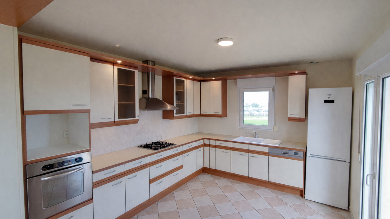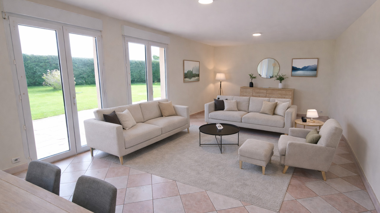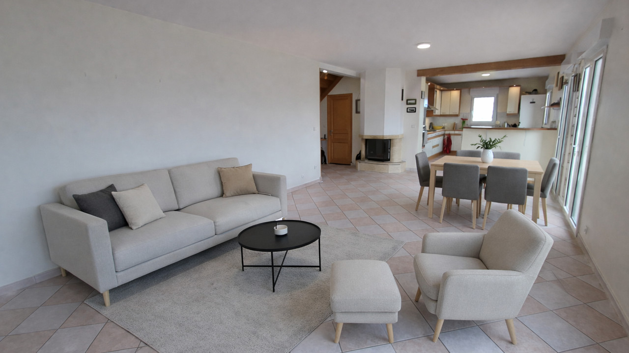 Extérieur : Portail électrique, stationnement 3–4 voitures, double garage/atelier, terrasses avant et arrière. Double vitrage, volets roulants, chauffage au gaz.