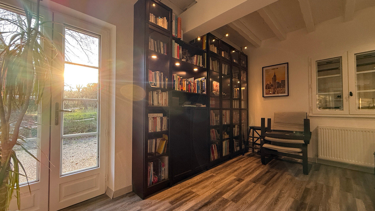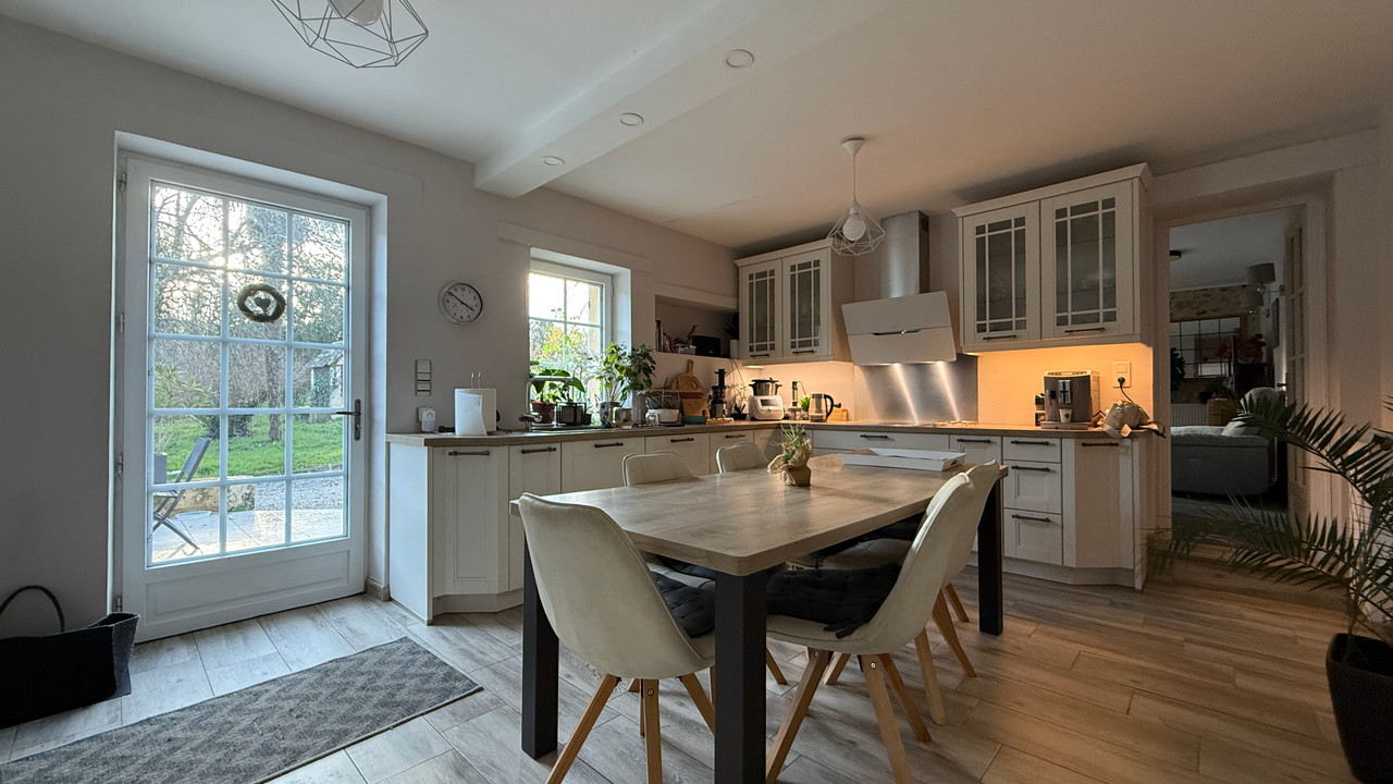 La maison principale offre environ 176 m² habitables avec cuisine dinatoire équipée, salon chaleureux avec insert, salle de bains et quatre chambres dont une avec dressing. Une pièce supplémentaire complète l'ensemble.