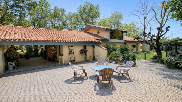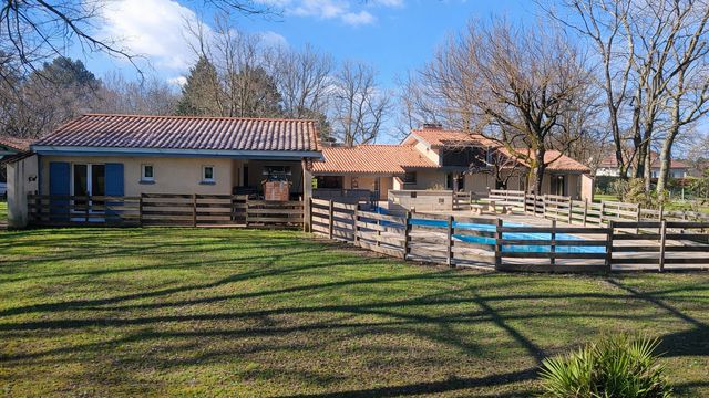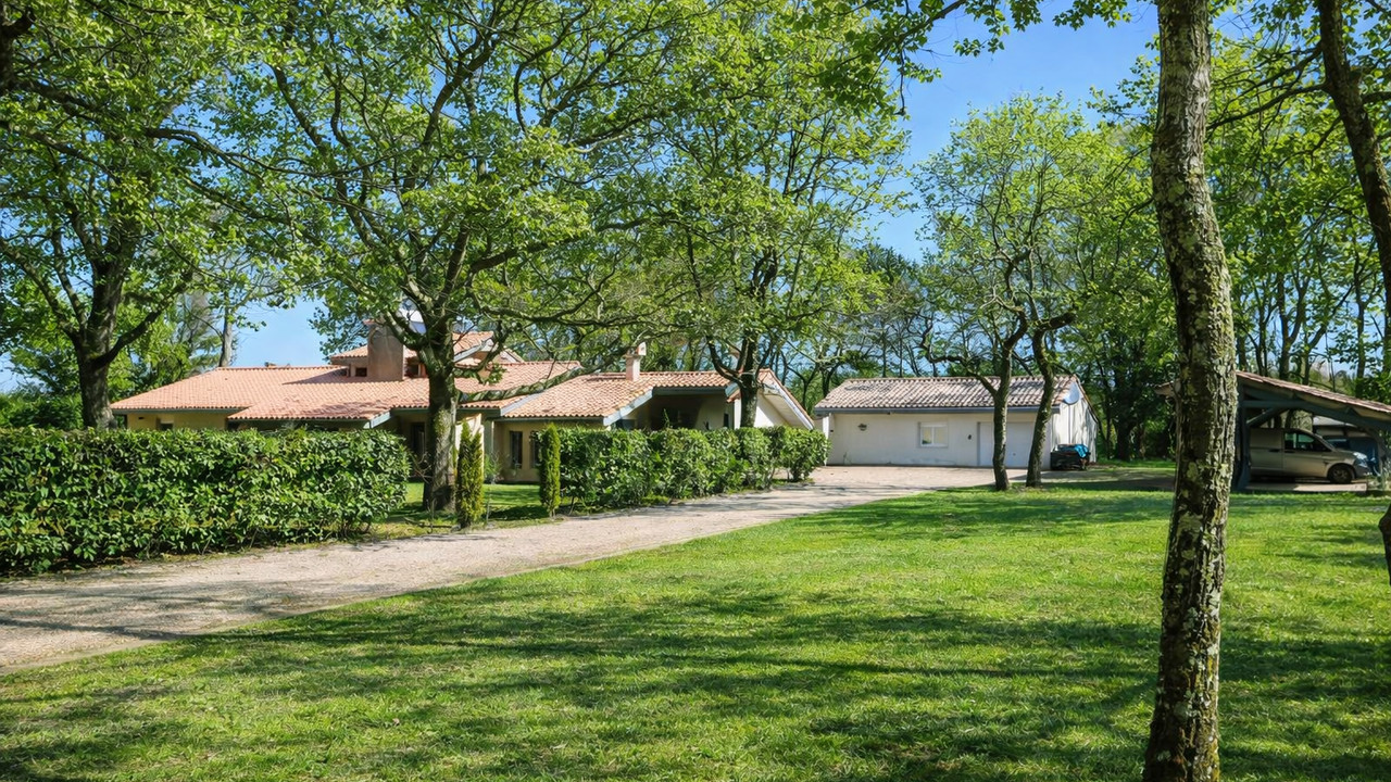 A41376SAG24 - Superbe maison d'architecte à Ménesplet, modernisée et entourée d'arbres matures dans un cadre calme et verdoyant. Spacieuse, elle propose plusieurs salons, une cuisine entièrement équipée et une mezzanine idéale pour bureau ou salle de jeux. À l'extérieur, terrasse généreuse avec barbecue couvert, piscine 12×5 m et studio indépendant pour invités ou location. Confort moderne : carrelage récent, pompe à chaleur, volets roulants et isolation sols/plafonds. Proche des commodités, gare et autoroute. Parfaite pour vie familiale ou investissement.