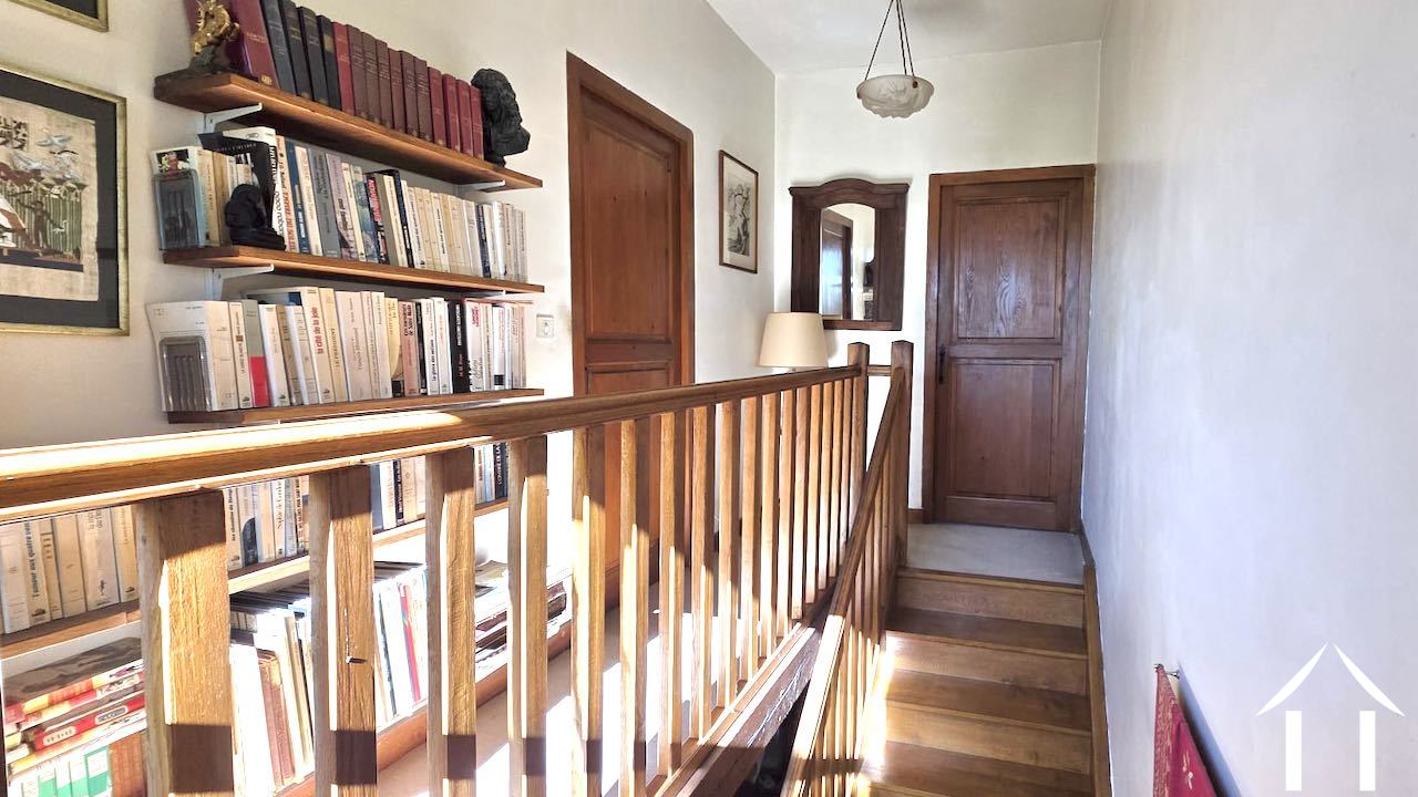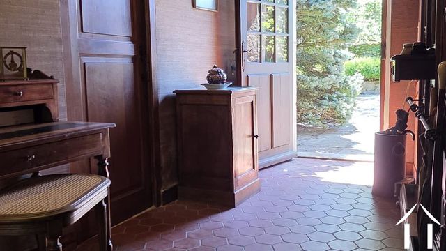 Quelques marches descendent vers un spacieux salon familial avec des fenêtres orientées à l'est et à l'ouest, remplissant l'espace de lumière naturelle. La cheminée en pierre impressionnante apporte de la chaleur pour les feux de bois, tandis que le plafond en chêne vous rappelle que vous êtes en Bourgogne. Le sol est recouvert de carreaux carrés en terre cuite disposés comme un tapis, bordés de dalles de Bourgogne. Des portes-fenêtres s'ouvrent sur la terrasse qui capture le soleil du matin, idéale pour les repas d'été.
