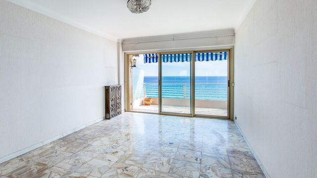 A24614OVI06 - Menton - Promenade du soleil. En front de mer et à deux pas de toutes les commodités, cet appartement trois pièces offre une vue mer panoramique de la côte italienne jusqu'au Cap Martin. L'appartement traversant est composé d'un séjour donnant sur la terrasse vue mer, d'une cuisine et de deux chambres avec placard donnant sur balcon, ainsi que d'une salle de bains et d'un WC indépendant. Une petite rénovation sera nécessaire pour devenir le parfait pied à terre sur la Côte d'Azur. Vendu avec 1 cave. Un parking en sous-sol est disponible au prix de 25 000,00 €. Les informations sur les risques auxquels ce bien est exposé sont disponibles sur le site Géorisques : georisques.gouv.fr.