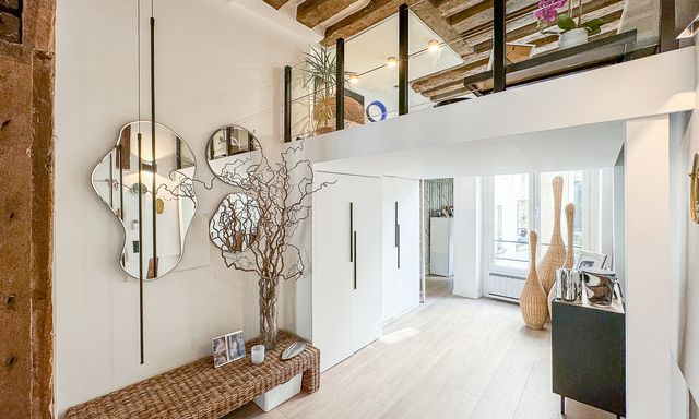 A28150HHE75 - Dans un immeuble de 1650, niché dans une rue secondaire tranquille, découvrez cet appartement magnifiquement rénové au deuxième étage. L'entrée spacieuse de 13 m² dispose de rangements sur mesure et d'une mezzanine. La superbe pièce principale ouverte (31 m²) offre une hauteur sous plafond de 3,4 mètres, une cheminée en marbre, des poutres du XVIIe siècle et une cuisine américaine équipée moderne. Une salle de douche avec WC (3,5 m²) et une mezzanine optimisent l'espace.