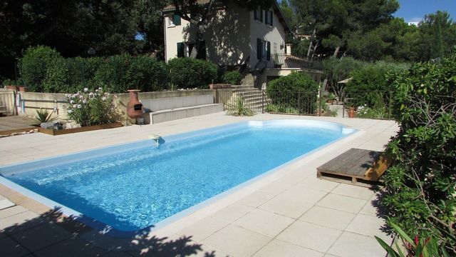 Dans le jardin 1900 m2, arboré d'essence méditerranéenne, se trouve une piscine avec deux terrasses ombragées par des pergolas, une dépendance en bois de 35 m²