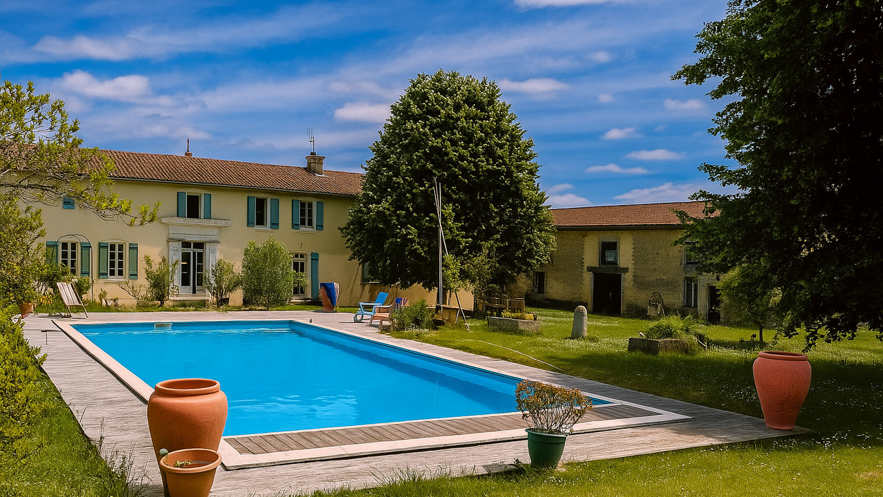 A37556NIE16 - Elegant logis charentais du XIXe, entre Bordeaux et Angoulême. Sur 6 ha avec piscine, maison d'amis rénovée et plus de 1 000 m² de dépendances, ce logis en excellent état allie charme d'époque et potentiel commercial. Actuellement une maison multigénérationnelle, mais également serait idéal pour créer un lieu de réception, un complexe de gîtes ou une résidence de prestige en pleine nature. Calme absolu, vue dominante et cadre authentique font de ce bien une opportunité rare.
