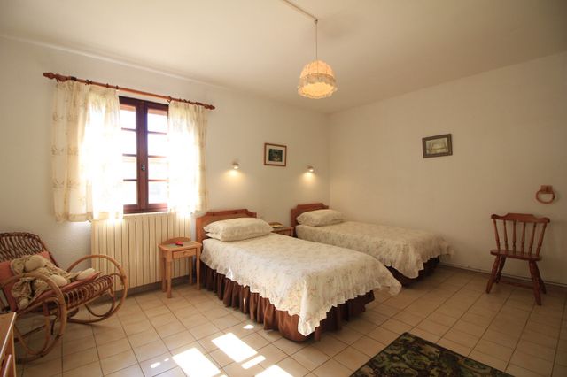 Située sur un terrain de 7535 m2, cette propriété comprend une maison principale de 179 m2, quatre pièces de réception, une cuisine équipée, un coin repas et cinq chambres, dont une chambre principale avec salle de bains au premier étage, accompagnée d'un petit débarras.
