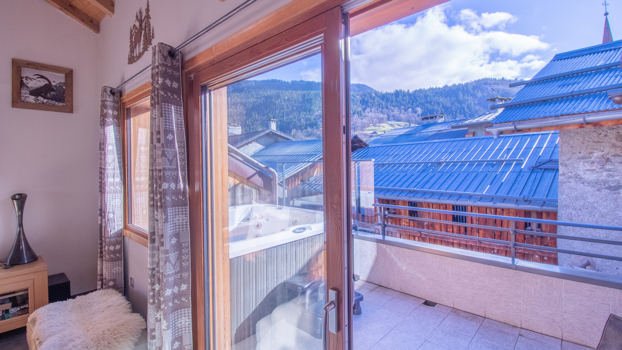 On the top floor, the light-filled living area with its wood-burning stove opens onto a south-facing, sunny terrace with a jacuzzi — the perfect spot to soak up the panoramic views of the surrounding peaks and the village bell tower.