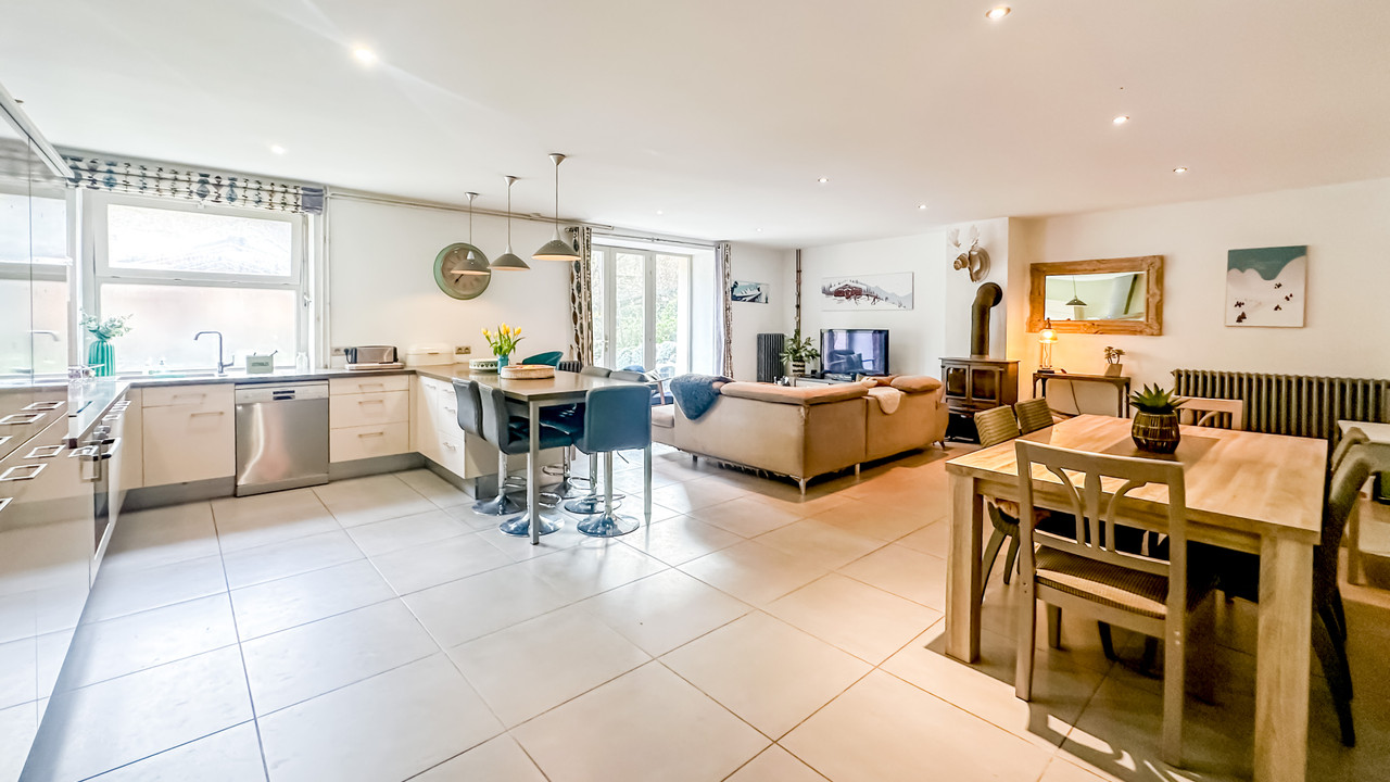 The main house features an entrance cloakroom leading into a spacious 53m² open-plan living area, combining dining and sitting spaces with a fully equipped kitchen offering ample storage. The sitting area leads to a south-east facing terrace and an additional south-facing garden, ensuring plenty of natural light and beautiful views of the garden and surrounding mountains. A WC and separate laundry room are accessed from the hallway, along with stairs leading to the first floor.