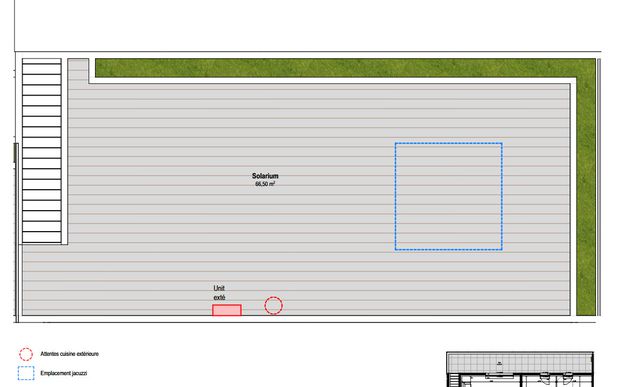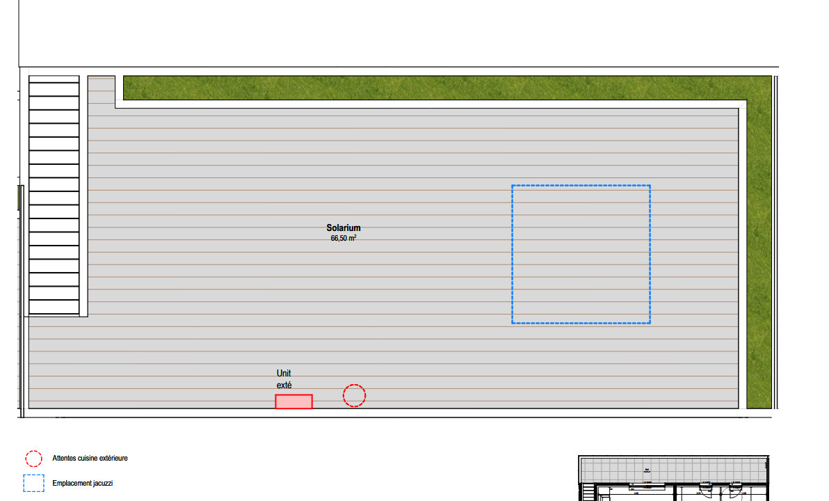 The living area consists of a large 43 m² living room with open kitchen, extended by a large 24.5 m² terrace, a true open-air room ideal for entertaining or relaxing with its 66 m² solarium.