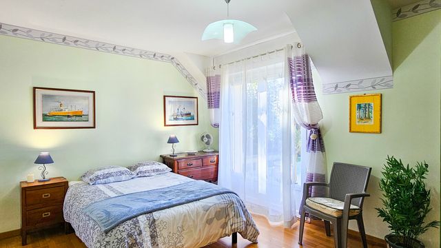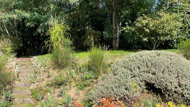 A40285EAM56 - Constructed by the present owners in 2005, this modern four-bedroom home combines comfort, efficiency and light-filled design. Its elevated setting offers sweeping views, with sunsets enjoyed from wraparound terrace. Generous insulation, a recently replaced condensing gas boiler (1,200L underground tank) and a log burner ensure year-round warmth, while multiple patio doors flood the interiors with natural light. The ground floor includes a striking garden room with vaulted ceiling, lounge, kitchen, shower room with WC, guest WC and two double bedrooms. Upstairs are two further bedrooms, a shower room, mezzanine studio and walk-in attic storage. The sous-sol provides secure parking for two cars, workshop, utility, storage and WC. Outside, landscaped grounds with powered shutters, terrace awning, greenhouse and 5,000L water recovery system, a practical well maintained property ready to move into.