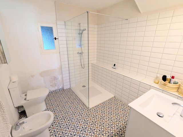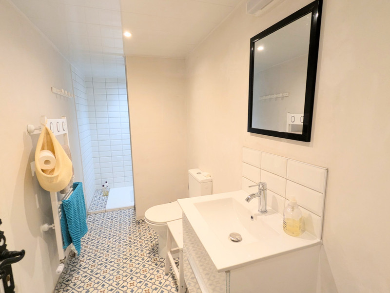 The ground floor features a large 24 m² kitchen with direct access to a sunny terrace, ideal for outdoor dining. A spacious 36 m² living room with a wood-burning fire and a 24 m² dining room (also with fireplace) provide welcoming family spaces. A modern shower room with WC completes the ground floor.