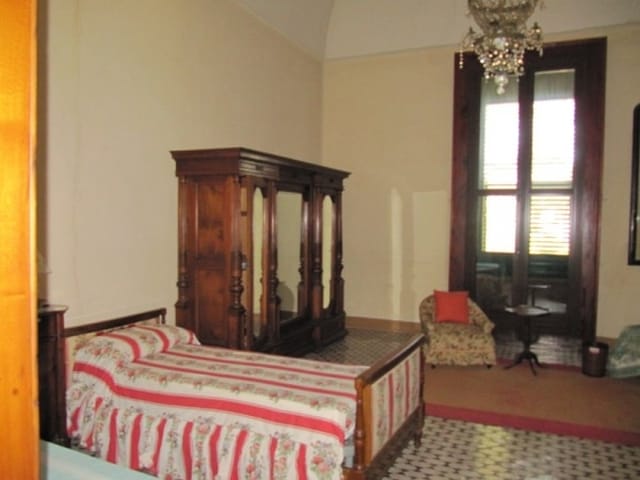 Dall'ingresso padronale si raggiunge tramite una doppia rampa di scale, il piano primo, composto da sette vani letto e da tre servizi igienici. Le volte dei soffitti presentano le varie forme architettoniche di un tempo: volte a stella,cielo di carrozza ed a botte ed i pavimenti sono antichi ed originali oltre a vari camini interamente in pietra e padronali.