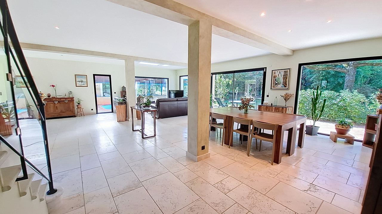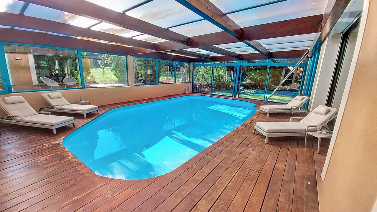 Set on a flat, landscaped plot of 2,500 sq m, it features a 65 sq m heated indoor pool, a true haven of well-being, opening onto a spacious 82 sq m living and dining room. The separate kitchen, with a pantry, opens onto two covered and open terraces.