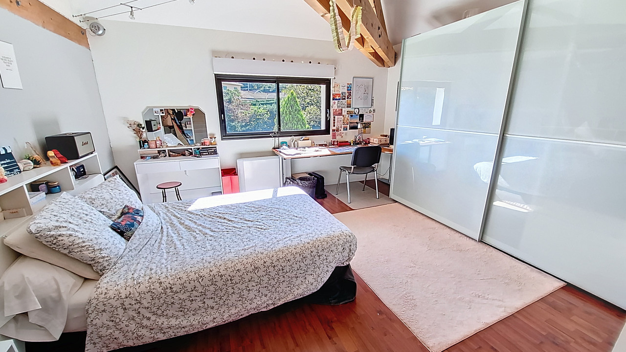 Upstairs, three large bedrooms, a bathroom and a toilet complete the property. A 76 m² garage, a separate guest house, high-end amenities, geothermal heating, and underfloor heating and cooling are also included.