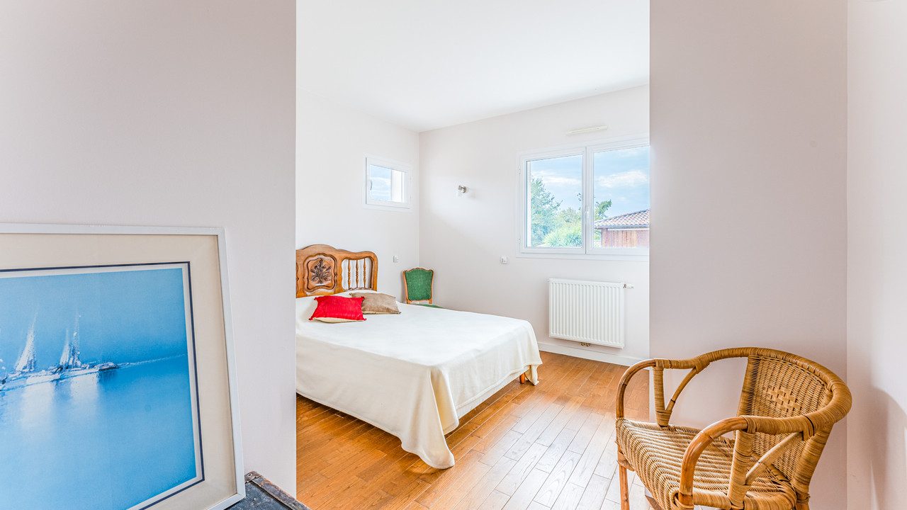 A41603EPR33 - This architect-designed villa, built in 2015 located in a calm residential area, offers 170 m² of living space with a total of six bedrooms three of which are on the ground floor which is also fully accessible to people with reduced mobility. The living area has beautiful cathedral ceilings, a fully equipped kitchen and an ajoining utility room. There are three shower rooms/bathrooms. Built with quality materials such as alimnium windows with intergrated electric stores, a heat pump, videophone, fibre, satellite. The gardens are private and well maintained with the posibility to add a swiming pool. You'll enjoy its proximity to the town center and all local amenities. The Atlantic beaches of Grand Crohot and the first oyster-farming villages are less than 10 minutes away by car. Bordeaux Airport is just 40 minutes away. Information about risks to which this property is exposed is available on the Géorisques website : https://www.georisques.gouv.fr