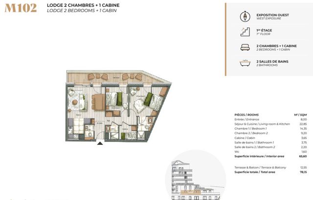 A39680JQB73 - There are 15 apartments available in this new off-plan resort development, located next to the piste and offering modern amenities. Prices range from 745,000€ to 1,900,000€, with options from a one-bedroom plus cabine bedroom unit (45m²) up to three bedrooms plus cabine (101m²).