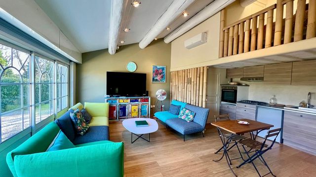 There is an adjoining independent apartment with a large living area, a kitchenette with mezzanine and a bedroom with an ensuite bathroom.