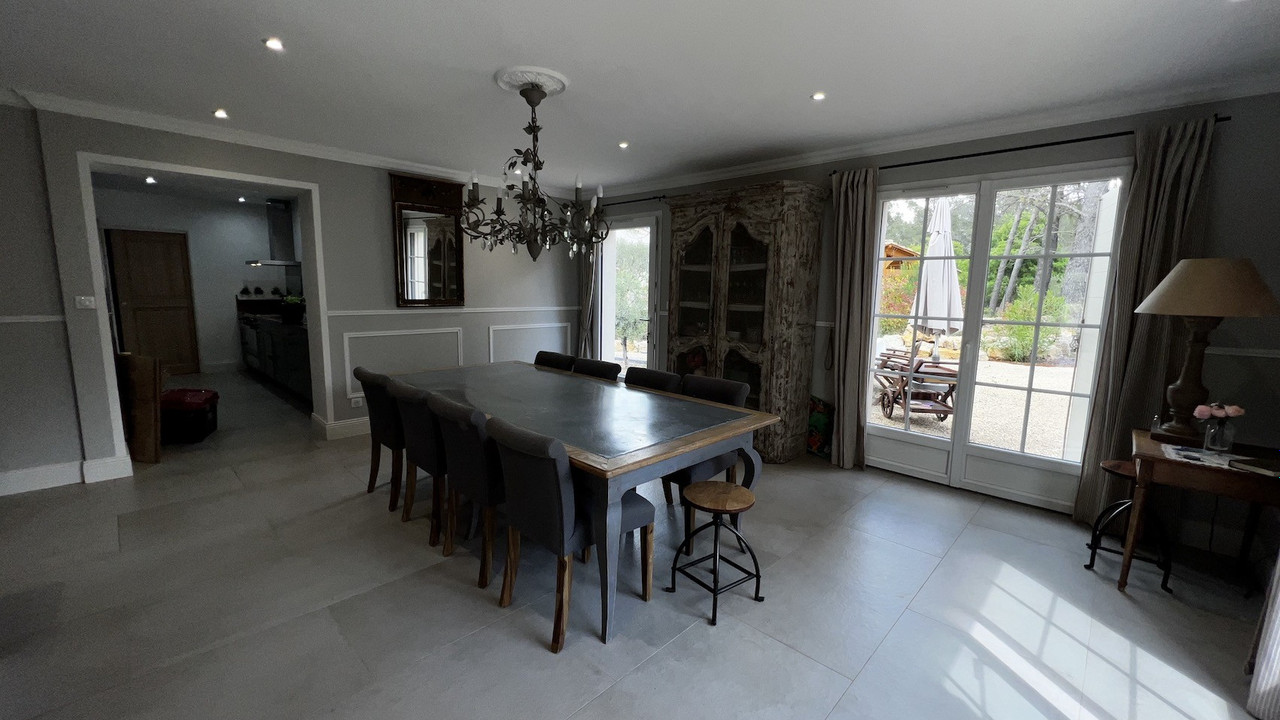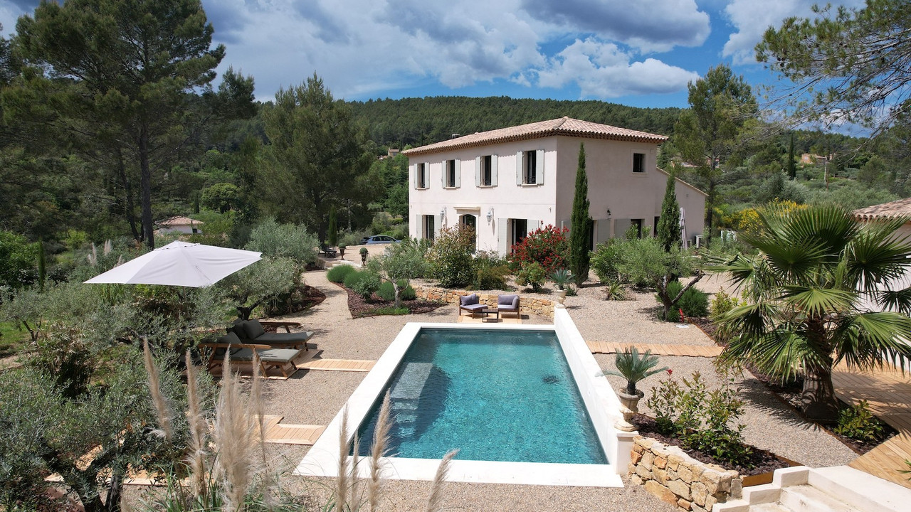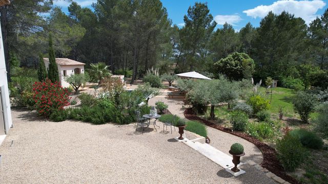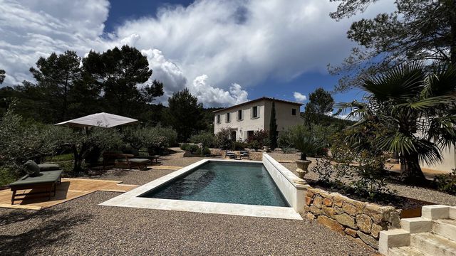 A37876GWI83 - Beautiful property in Cotignac, not overlooked, in a quiet setting with lovely views. The gardens of 4,800m² also features a beautiful swimming pool with a pool house and a garage. On the ground floor: entrance hall, large living room with a wood-burning stove opening onto the garden and pool, spacious dining room, modern and fully equipped kitchen, pantry/laundry room, and toilet. A beautiful staircase leads to the upper floor: a hallway that can be used as an office, a comfortable master suite with a dressing room, private shower room, and WC, three other south-facing bedrooms, and a shower room with WC.