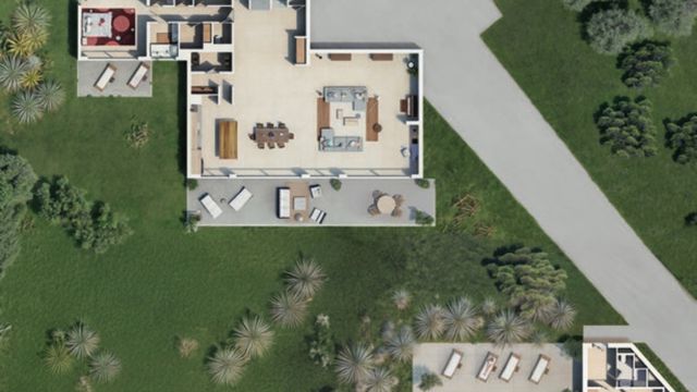 Designed with elegant contemporary architecture, it features bright, spacious interiors over two levels, including a large living area opening onto the terraces, 5 luxurious bedroom suites each with dressing room and private bathroom, an office, laundry room, pantry, wine cellar, and garage.
