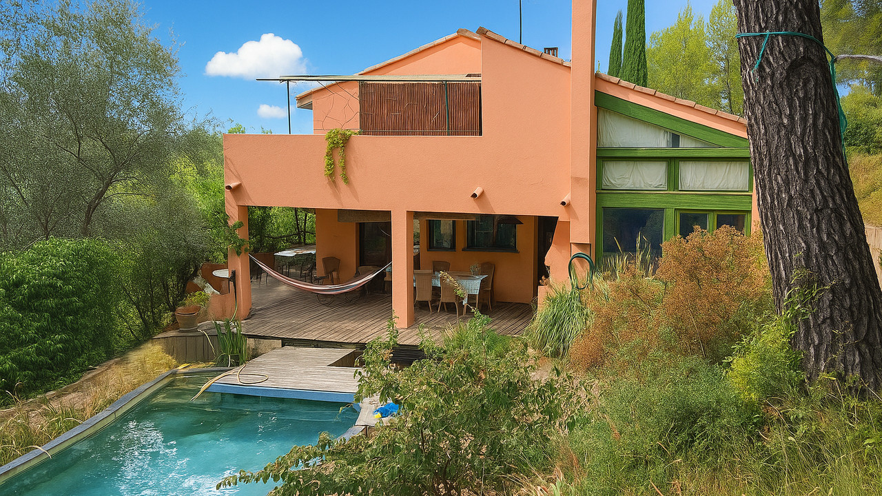 A39578GES34 - Nichée dans un espace privatif de plusieurs hectares, cette maison offre un cadre de vie exceptionnel. Afin de préserver ce lieu enchanteur, tous les propriétaires ont acheté 1 hectare de garrigue non constructible, garantissant la tranquillité et la beauté naturelle du lieu