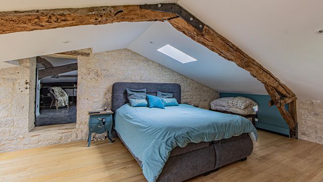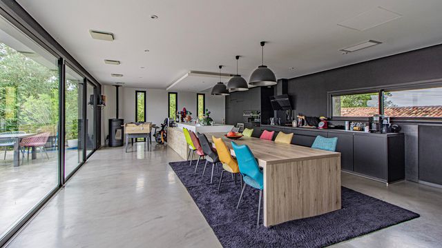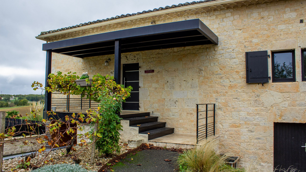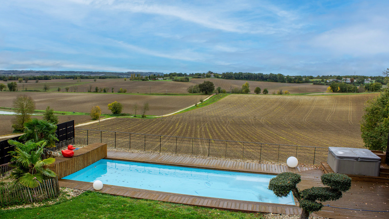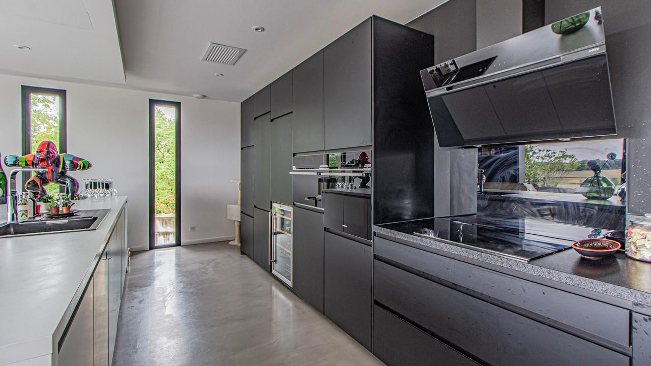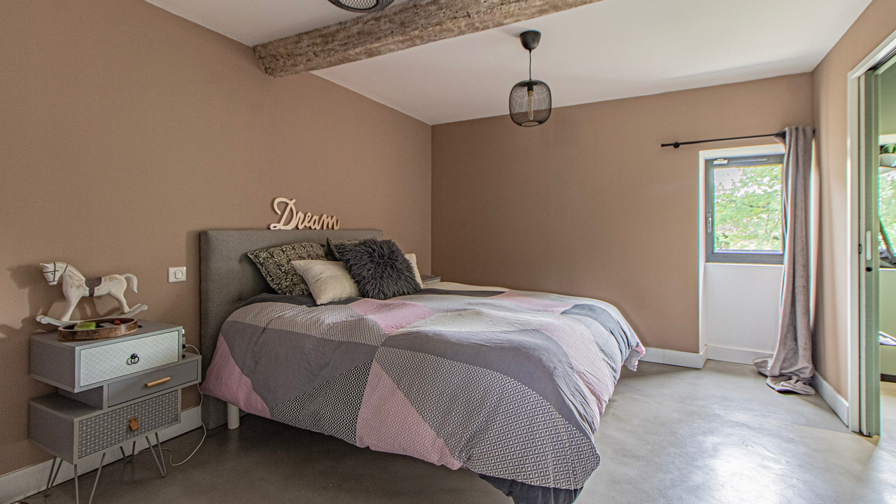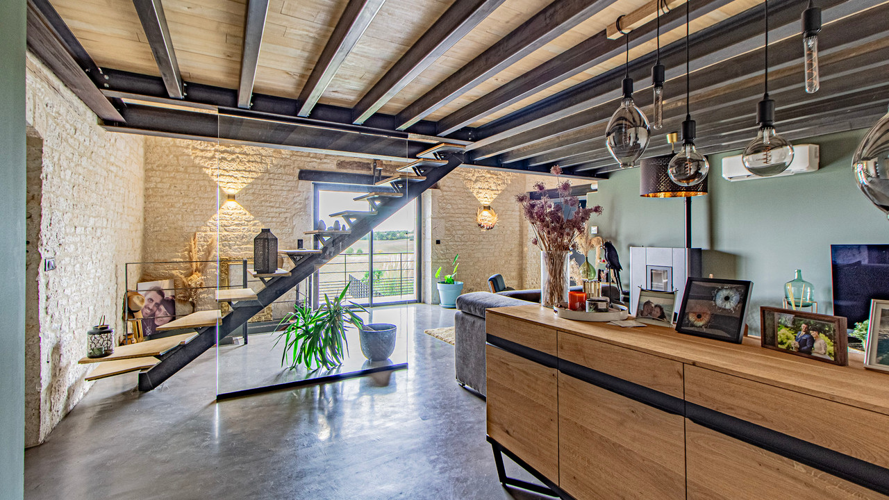 A40730SNM46 - This beautifully renovated home perfectly blends old-world charm with sleek modern design. The stylish salon with a woodburner opens into a breathtaking 72m² kitchen and dining area, filled with light from large windows that open onto a sunny terrace with pool and countryside views. There are two elegant bedrooms, each with a dressing room and ensuite bathroom. On the lower level, a superb 35m² studio apartment offers a bedroom, kitchen/diner, shower room, WC, and private access—ideal for guests or rental. Outside, enjoy a large terrace, poolside studio with kitchen-diner and shower room, extensive decking area with spa, and a secure landscaped garden. Beneath the terrace is a vast parking area. Every detail has been designed with imagination, seamlessly combining white stone and black metal for a striking, contemporary finish.