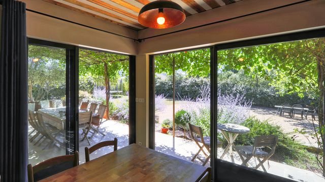 - A large living room with an American kitchen and bay windows, opening onto a large terrace. Under the shaded pergola, you can enjoy life all year round.