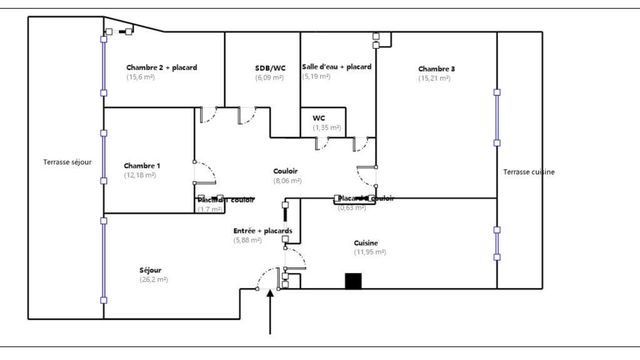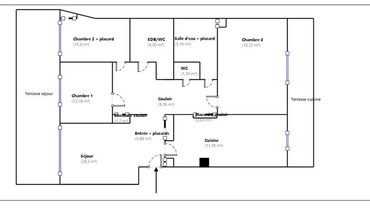 The apartment comprises an entrance with built-in closets, a living room, an independent kitchen, three bedrooms, a shower room, a bathroom with WC, a guest WC, and ample storage space.