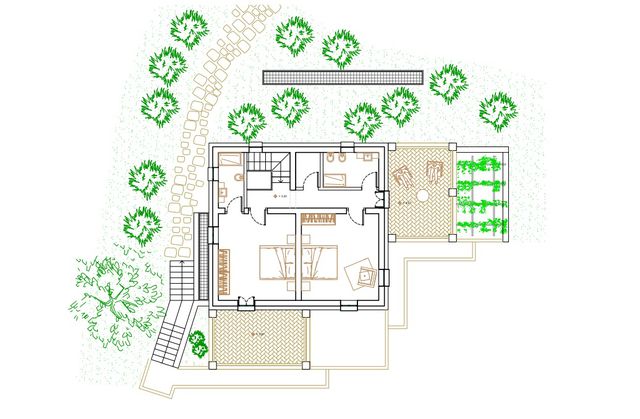 Besides a kitchen and living-dining room with vaulted ceilings and french doors opening on the patio the ground floor consists of a double bedroom with en-suite bathroom, a service bathroom, a laundry room, and a technical room.