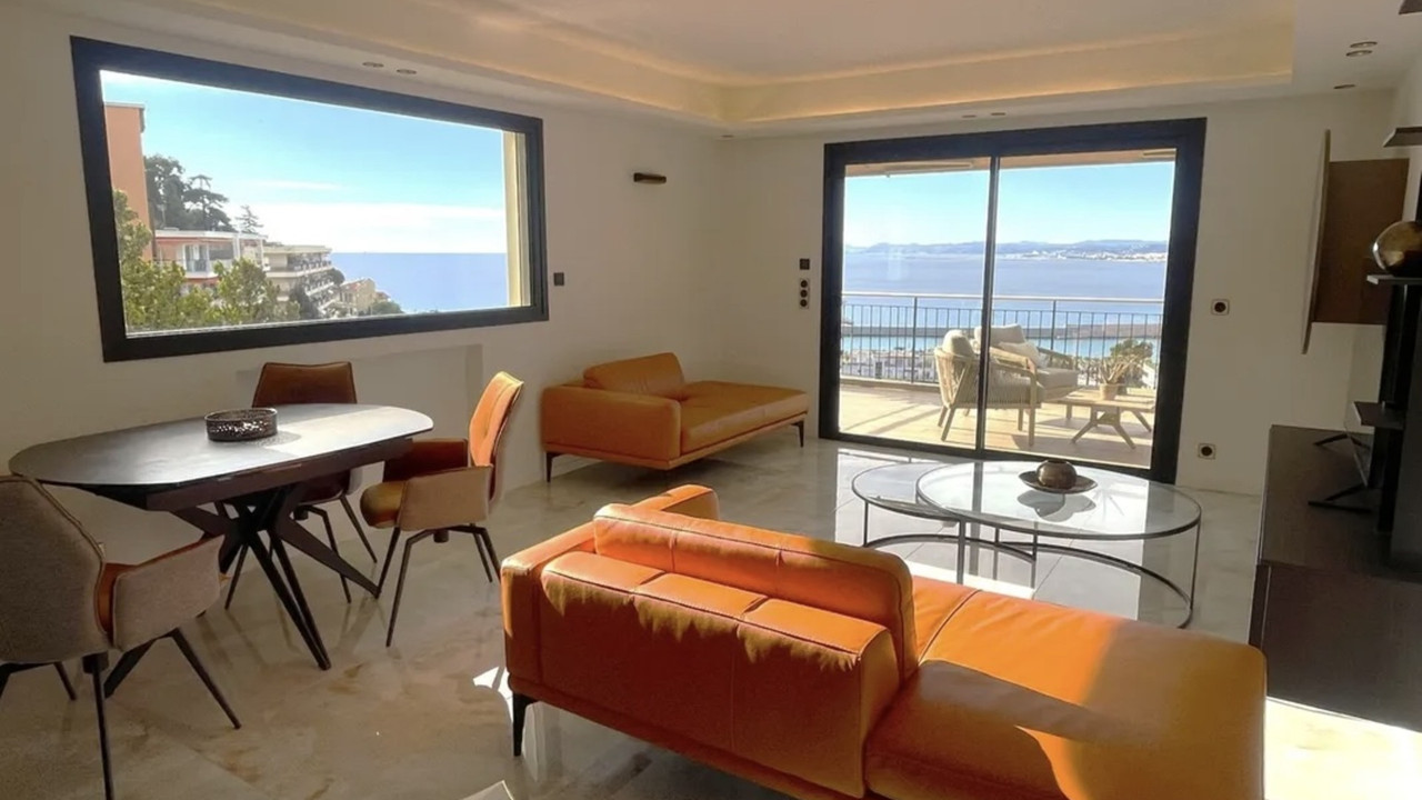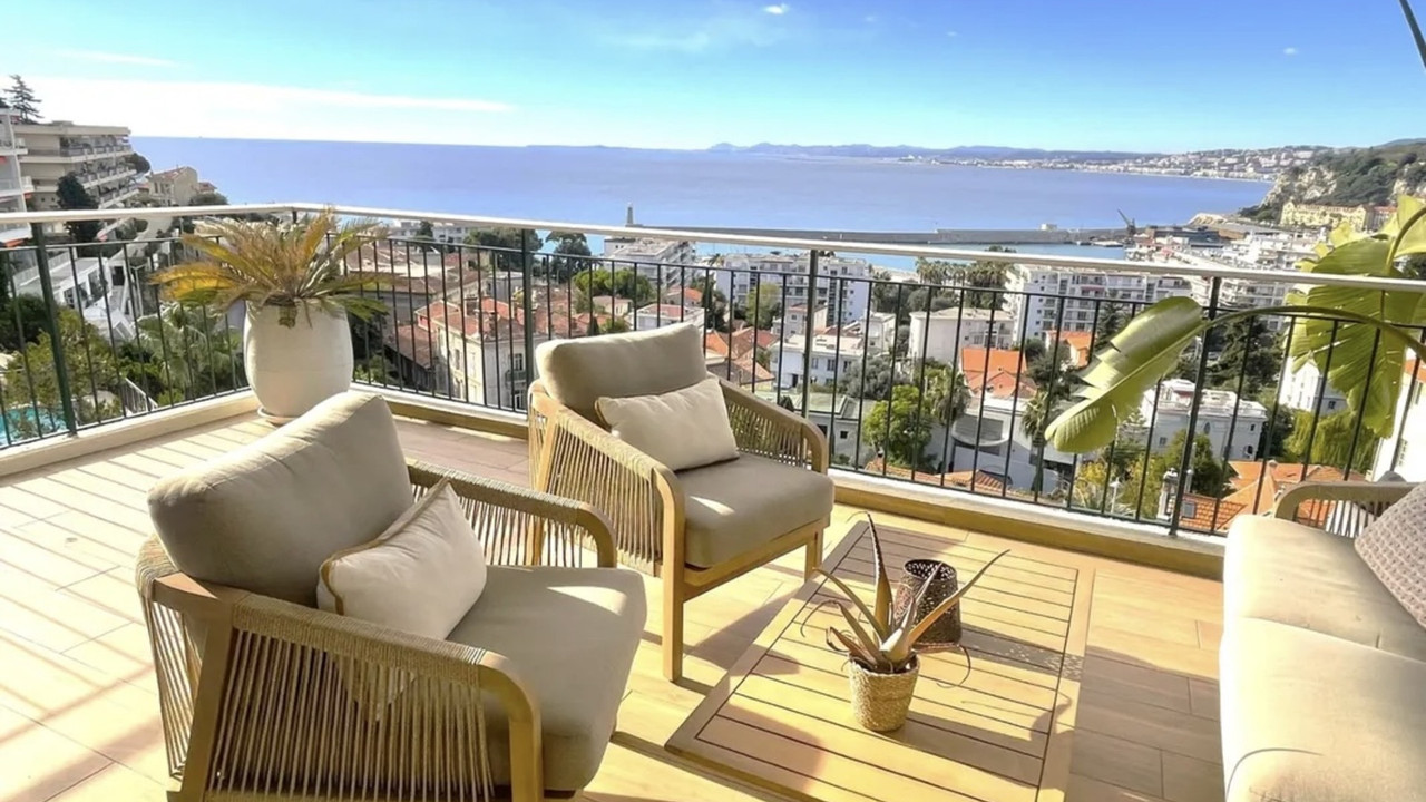 Renovated apt. 85m², 26m² terraces, 3 rooms, 2 beds, 2 bathrooms, 2 toilets. Outdoor parking + cella