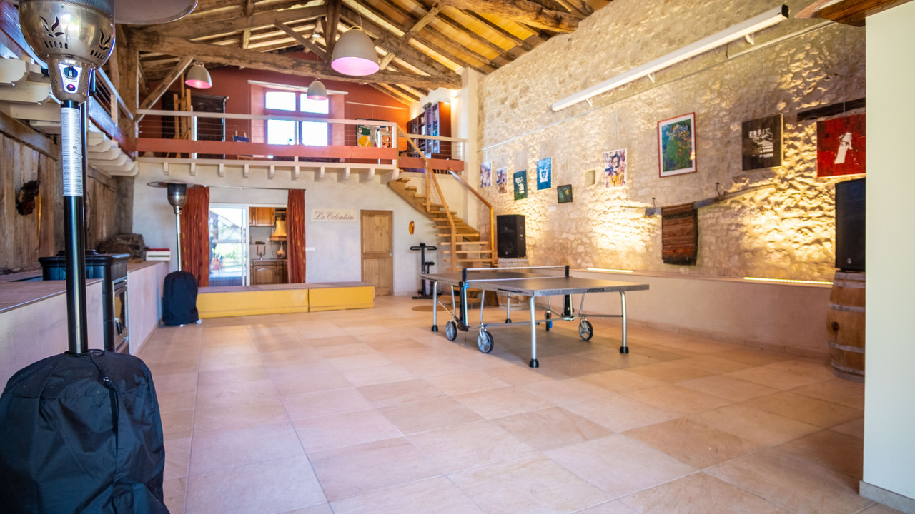 On more than 3 hectares, with a dominant view, it is composed of a fully renovated main house, a barn with 2 studios (47 and 41m ²) and in its centre a reception room of more than 90m ² with a mezzanine that represents an additional space of 86m ². It has a large courtyard of 71 m².