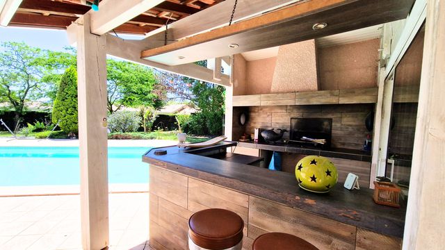Outside: 2,198 m² of enclosed land with a 10x5 m chlorine pool (fed by a borehole), a 15 m² summer kitchen, a terrace, a double garage, and a carport for a camper van.