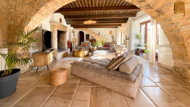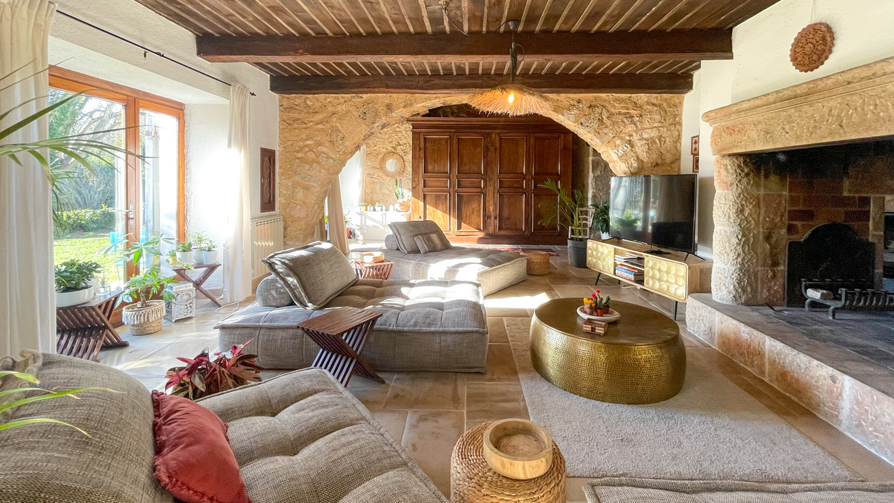 On arrival, you'll be seduced by the vast living room of over 120 m², with its beautiful stone floor and majestic vaulted ceilings. The central open fireplace creates a convivial space for spending time with family and friends.