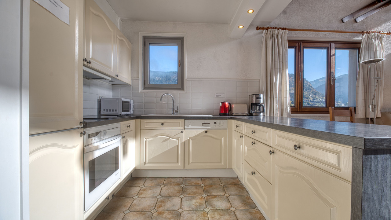 Its dual-aspect design offers panoramic views and multiple orientations. This property is sold fully furnished and includes a large cellar, a ski locker, and a secure garage.