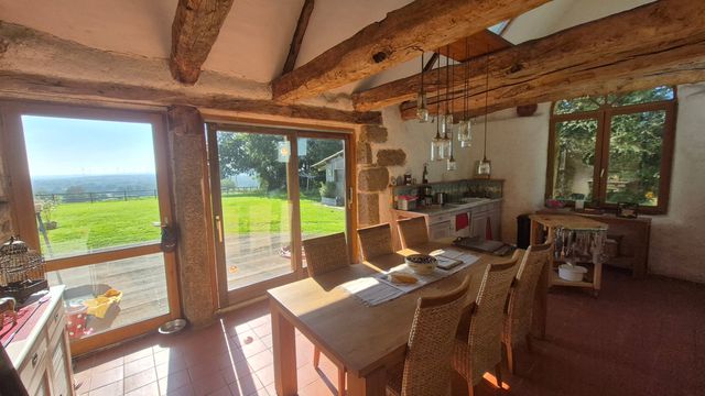 The main house of 150 m², facing due south, combines comfort and character with a cathedral-style fitted kitchen, large living room with monumental fireplace, five bedrooms and two bathrooms.