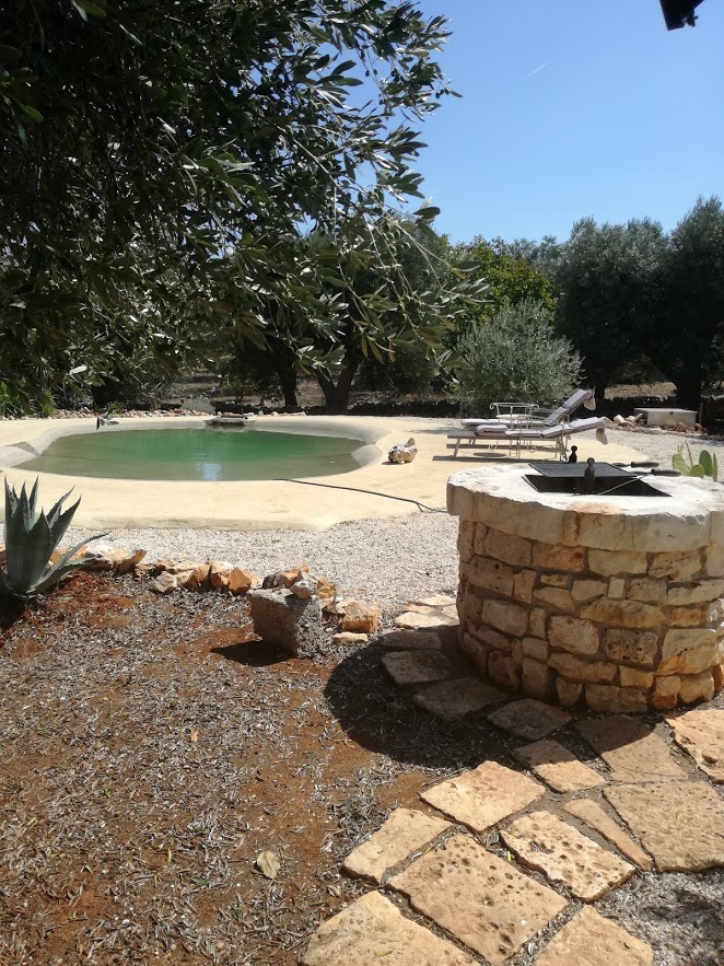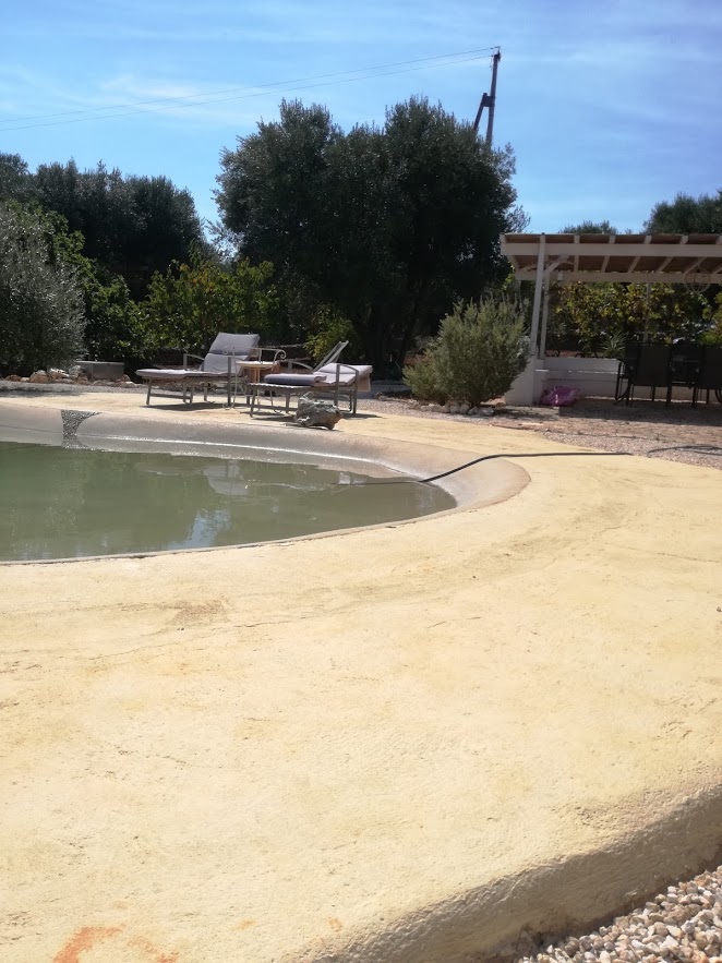 Inferriate, zanzariere, cancello automatico con muretti a secco perimetrali, zona relax con porticato esterno, zona cucina esterna e piscina biodesign.