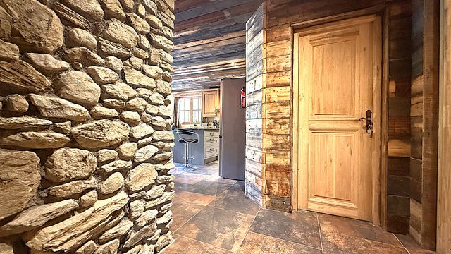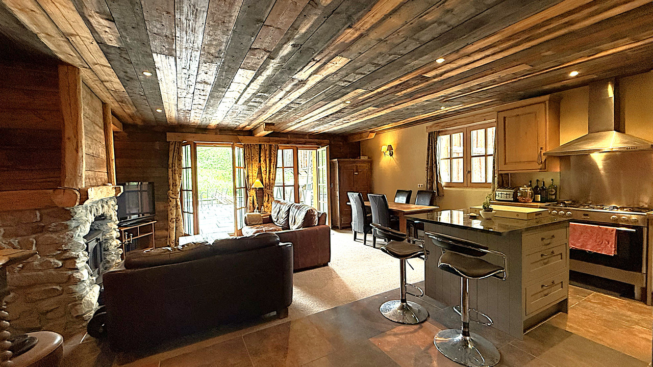 A37755JQB73 - Located in the heart of the Bataillette area of Sainte Foy Tarentaise a Large traditional Savoyarde style 1-bedroom apartment comprising an open plan living room with stone built fireplace and log burner, a fully equipped kitchen with island, a dining area with mountain views, a double bedroom with terrace to the north and a large bathroom.